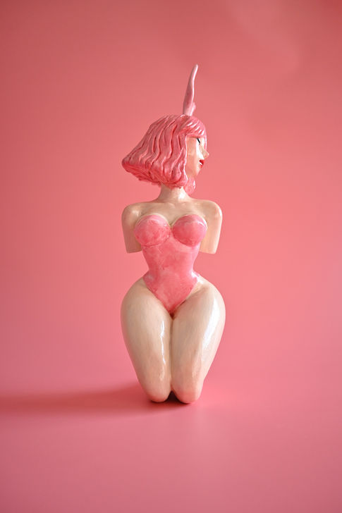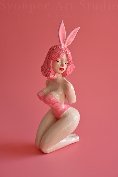Cotton the rabbit in pink, dressed in the classic bunny look.